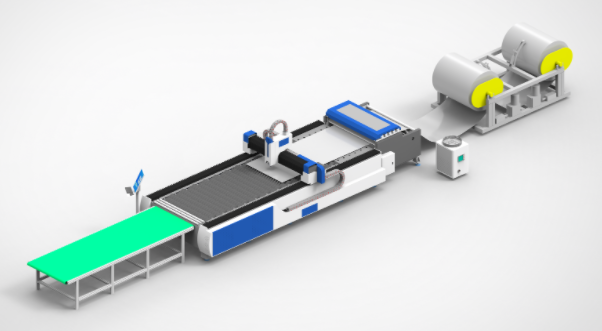 激光切割自動旋轉(zhuǎn)機床(俗稱;全自動卷料光纖激光切割機廠家,提供旋轉(zhuǎn)平臺光纖激光切割機,全自動卷料送料激光切割機,卷料激光切割生產(chǎn)線 滾動臺面光纖激光切割機,自動上料激光切割機,風管激光切割機自動上料下料,通風管道風管激光切割生產(chǎn)線,風管激光開料機,通風管道光纖激光下料機,卷材全自動激光切割機送料設(shè)備):包括卷料料架,校平裝置,激光機床床體、接料平臺,自動刀條旋轉(zhuǎn)組件;工作原理:首次入料卷料通過校平機校平后進入激光切割平臺進行切割,切割完成后校平機自動送料,旋轉(zhuǎn)平臺自動把切割完成的配件輸送到接料平臺,校平機送料完成后系統(tǒng)運行切割第二張排版圖料件,同時可進行切好料件的編號收集工作,以此往復工作大大提高整體加工速度及效率。